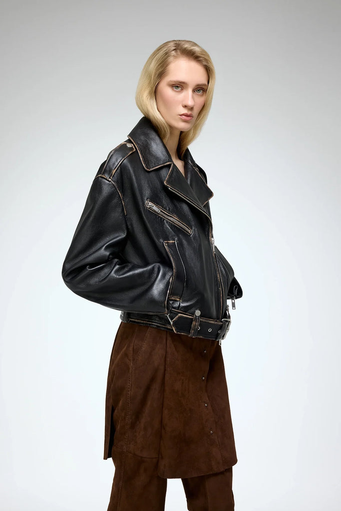 Kurze Bikerjacke im Vintage-Stil mit Gürtel und Schnalle. Asymmetrischer Reißverschluss, Bikerkragen, Seitentaschen, Druckknopfleisten an den Schultern.
