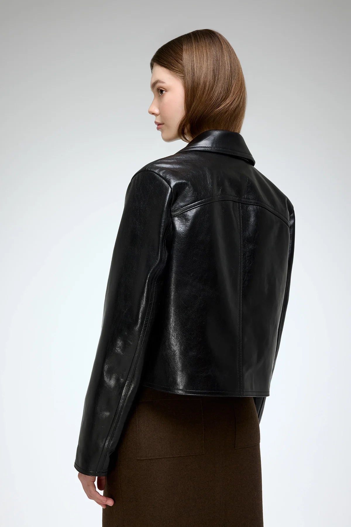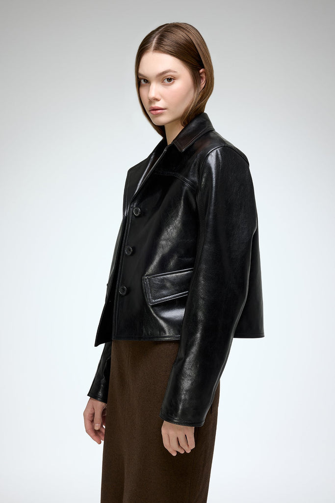 Kurze, kastenförmige Lederjacke im Blazer-Stil mit Knopfleiste, aufgesetzten Taschen und kleinem Reverskragen. Moderner und strukturierter Look.