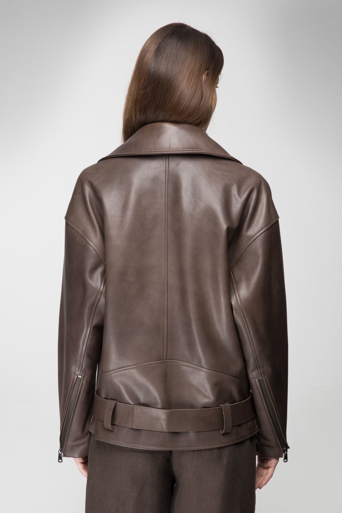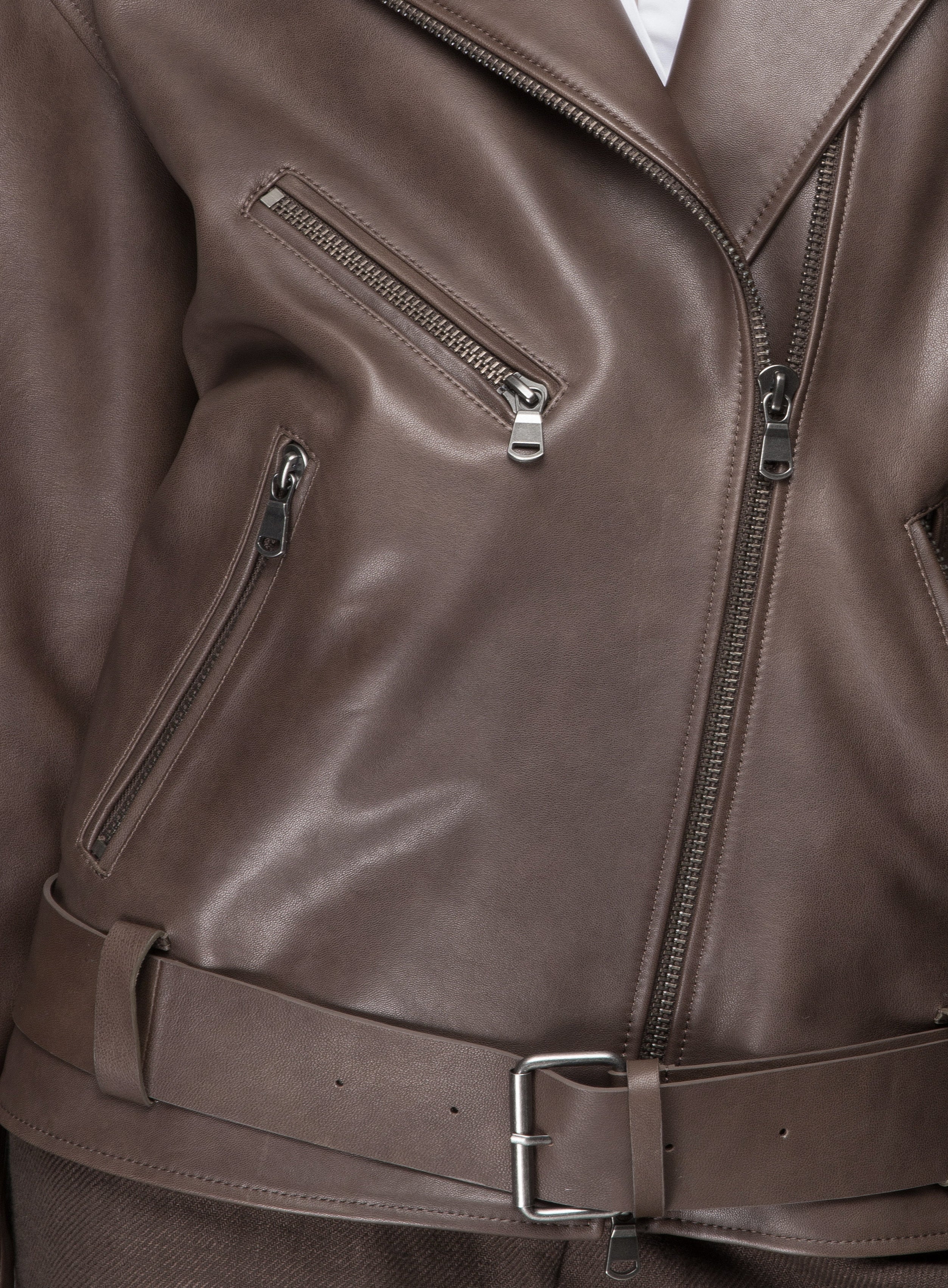 Reguläre, hüftlange Bikerjacke mit Gürtel und Schnalle. Asymmetrischer Reißverschluss und farblich abgestimmte Accessoires sorgen für einen minimalistischen, eleganten Look. Reißverschlusstaschen und ein Stehkragen mit Druckknopf runden das Design ab.