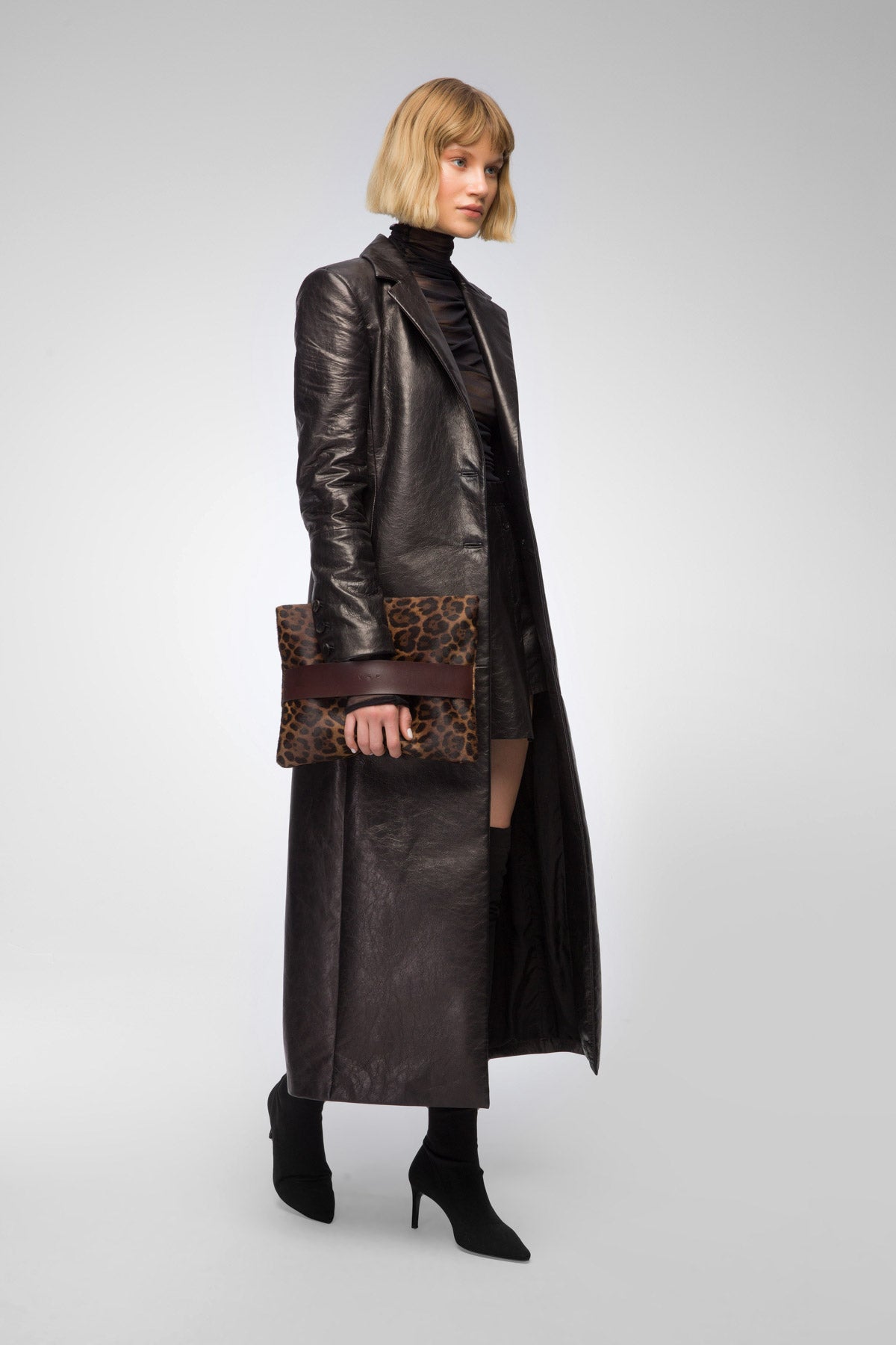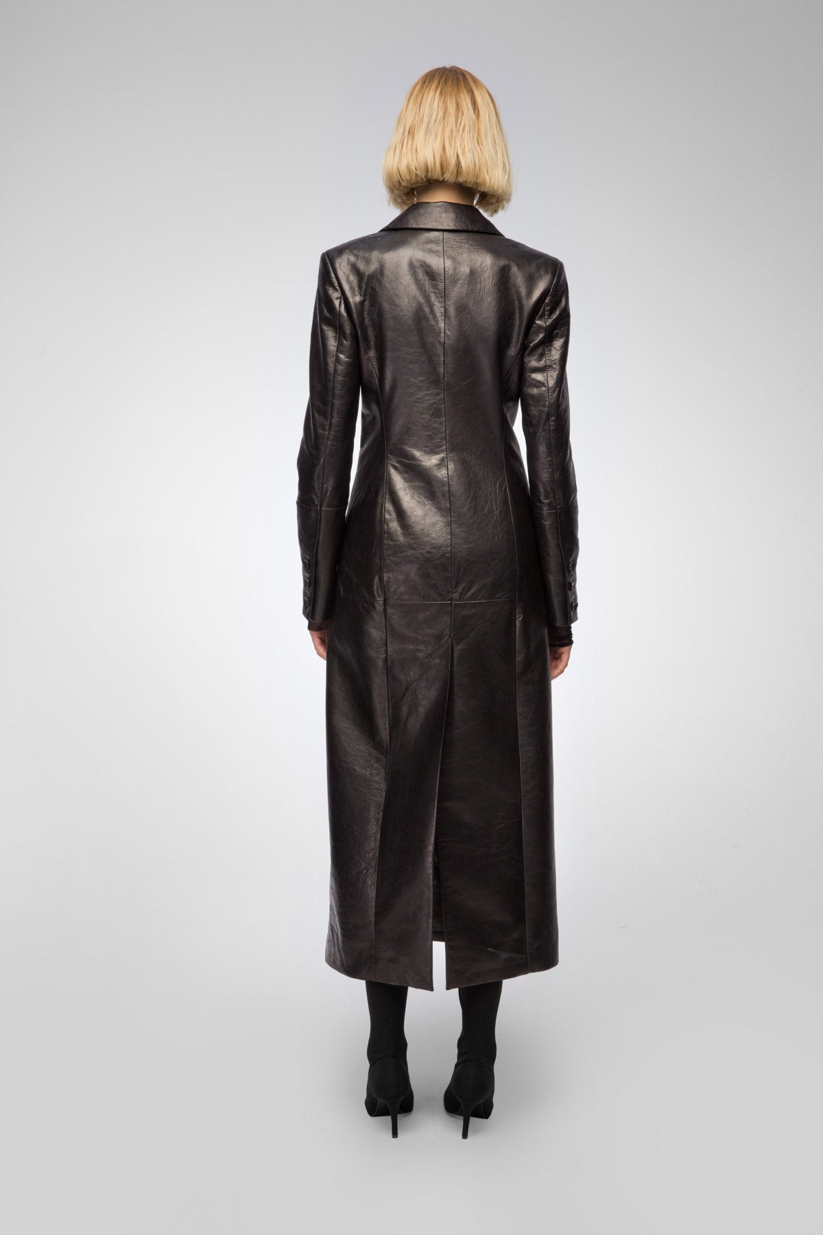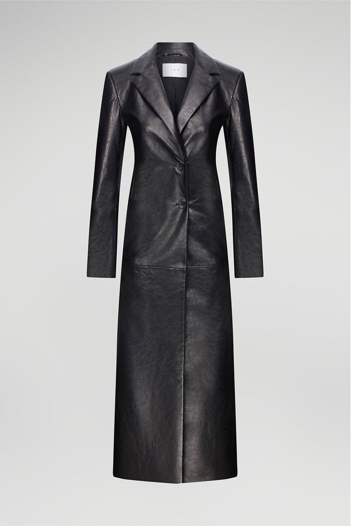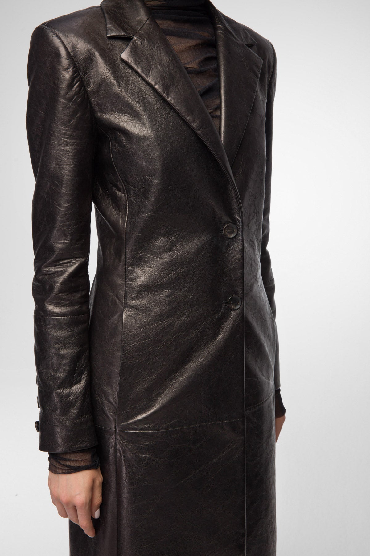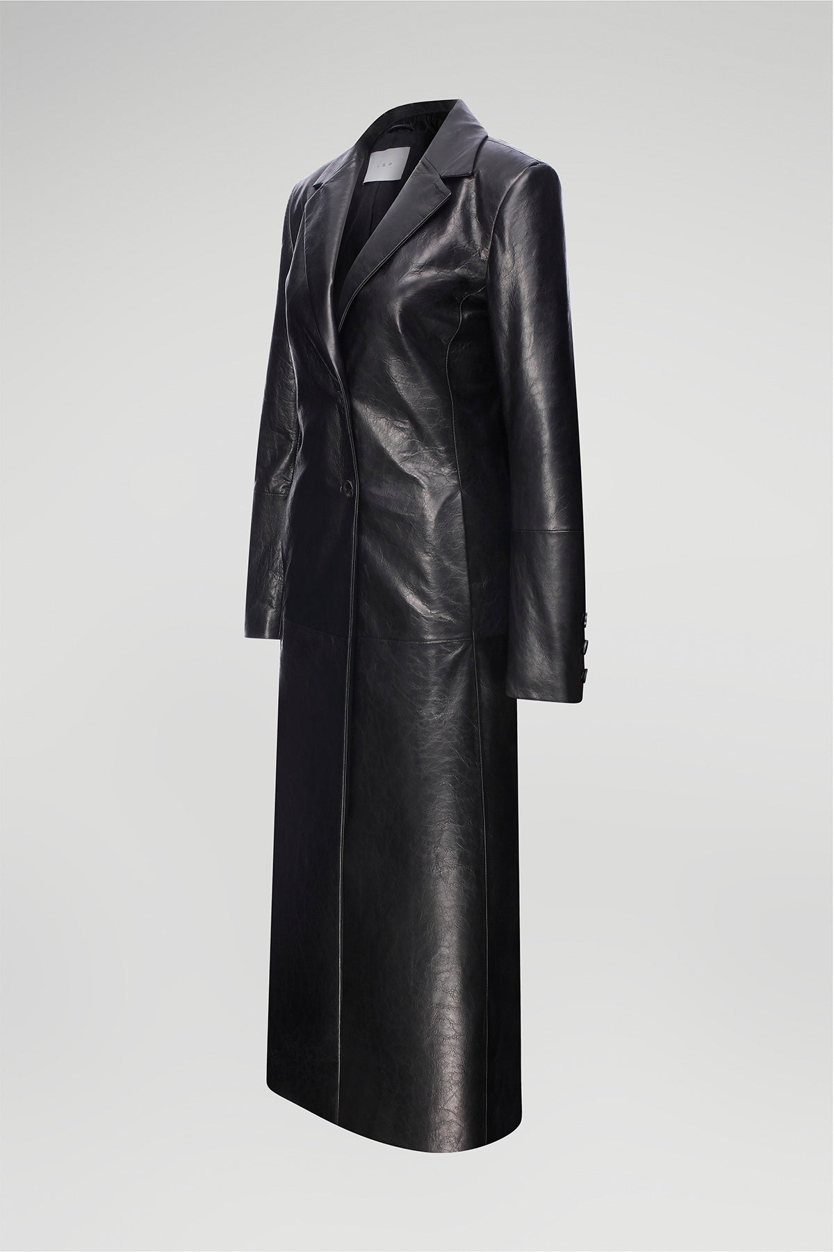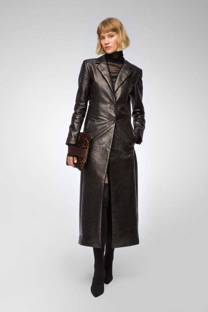 Taillierter, einreihiger Ledermantel mit Seitentaschen. Der Doppelknopfverschluss verleiht ihm eine elegante Note. Gefertigt aus hochwertigem Lammleder (100 %) mit luxuriöser Verarbeitung. Die offene Vorderseite unterstreicht den raffinierten, eleganten Look.