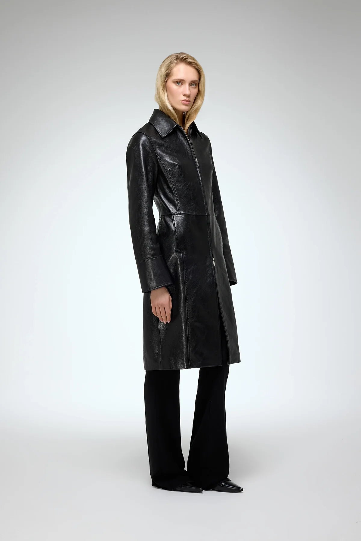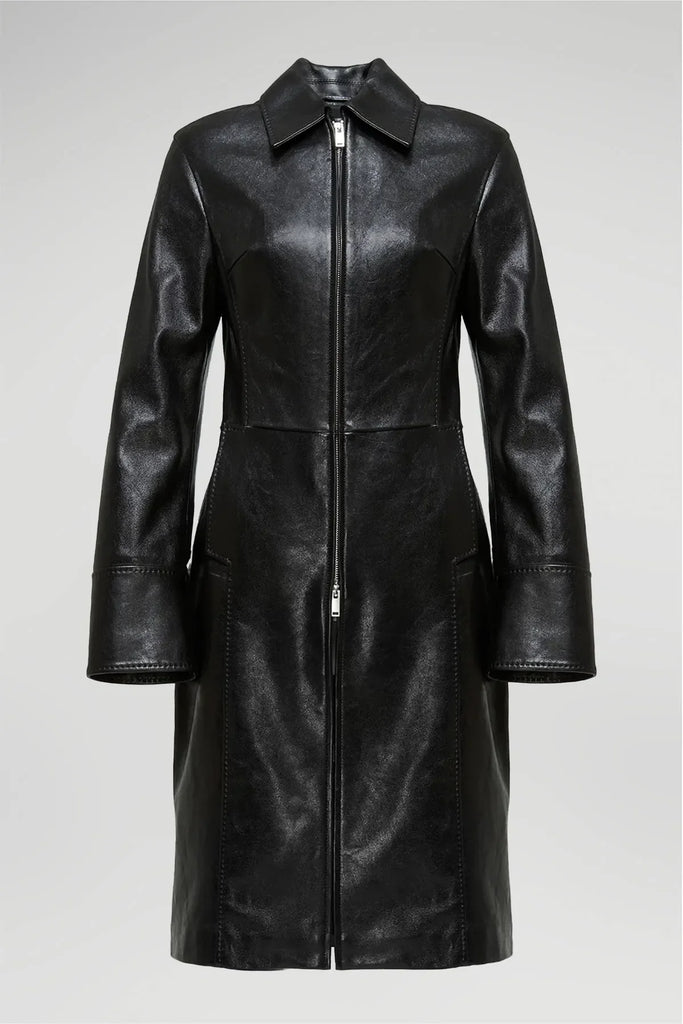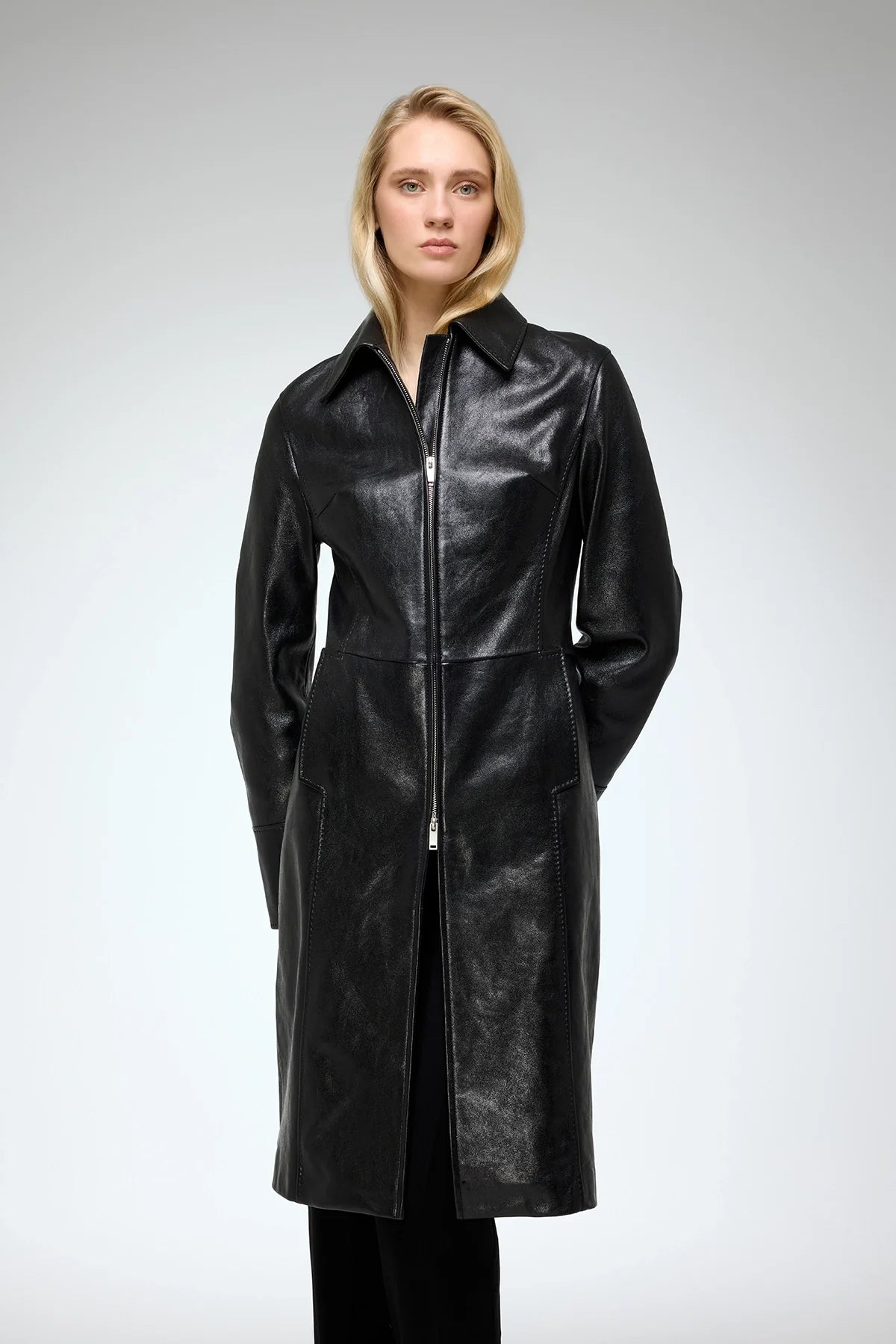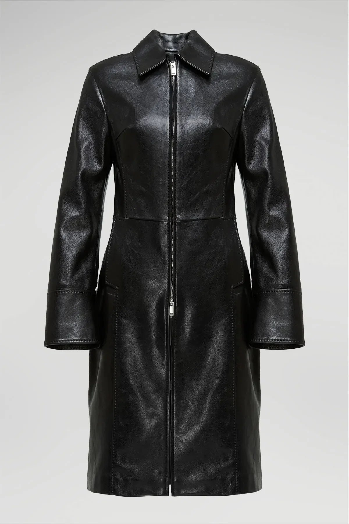 Hemdkragen, mittellanger, taillierter Ledermantel mit Reißverschluss. Reguläre, taillierte Passform mit Seitentaschen für einen eleganten und raffinierten Look.