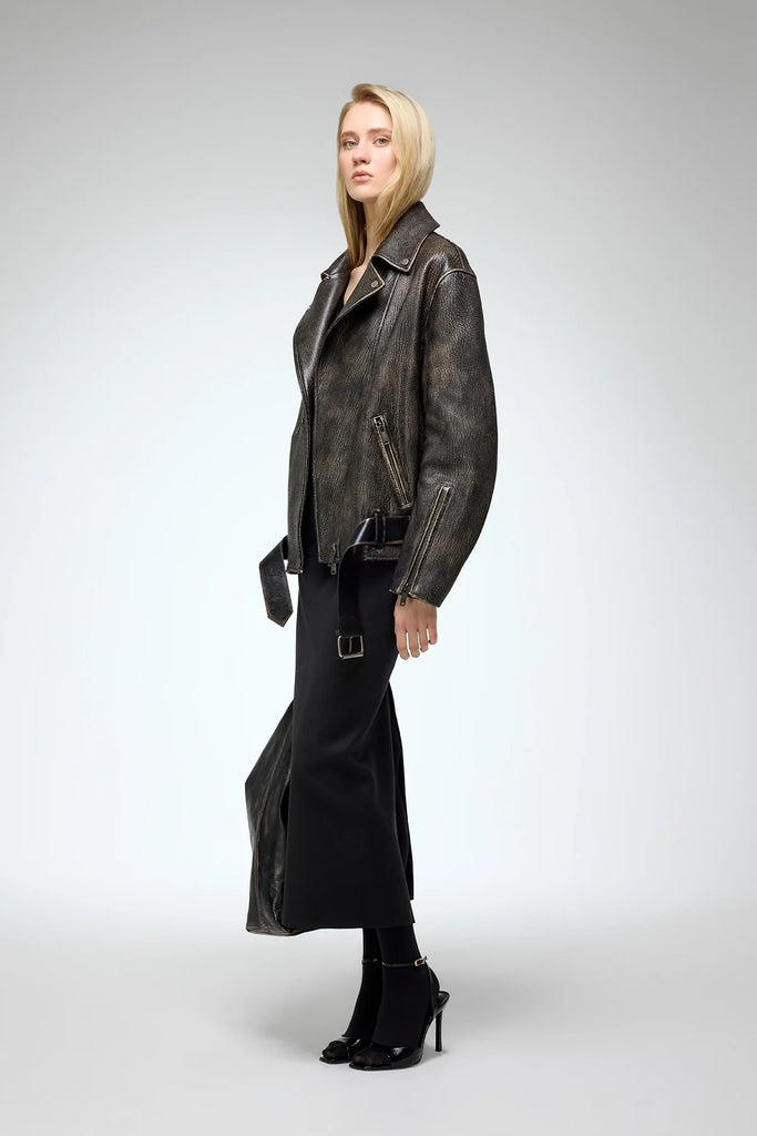 Vintage-Lederjacke im Biker-Stil mit Used-Look und übergroßer, hüftlanger Passform. Ausgestattet mit einem Gürtel mit Schnalle, asymmetrischem Reißverschluss, seitlichen und Brusttaschen mit Reißverschluss sowie einem Bikerkragen mit Druckknopfverschluss.