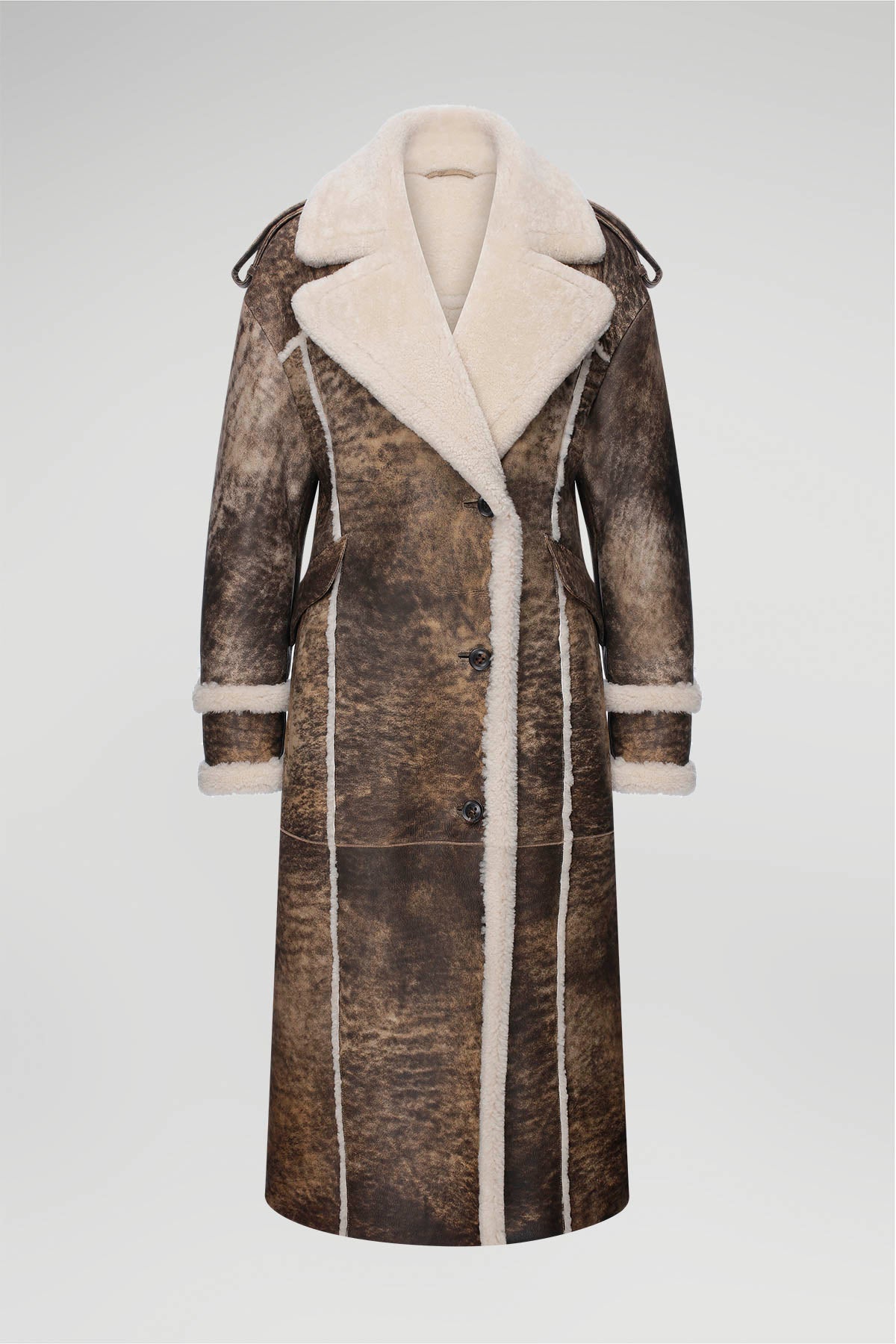 Langer Shearling-Mantel im Vintage-Stil mit überkreuzter Vorderseite und Knopfverschluss. Er verfügt über seitliche Pattentaschen, Schulterriegel, Pelzbesatz und einen doppelreihigen Reverskragen für einen klassischen, eleganten Look.