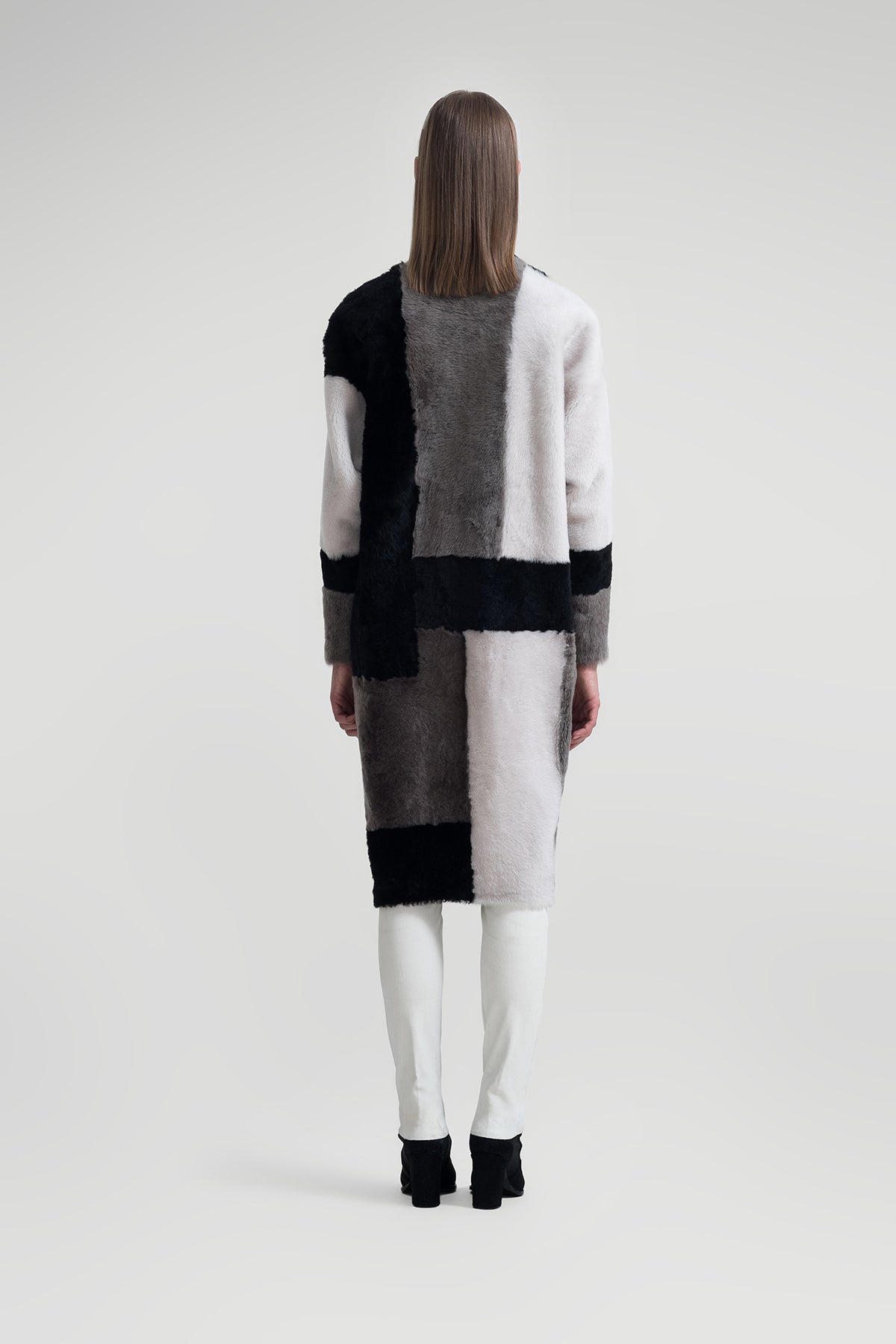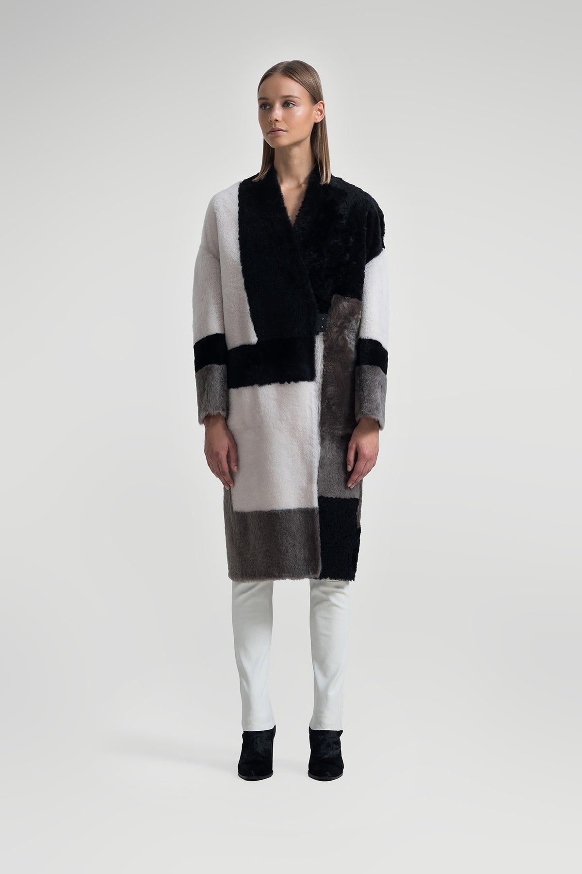 Eleganter Mantel mit aufwendigen Applikationen und Wollbesatz. V-Ausschnitt. Ledereinfassung. Eingrifftaschen vorne. Angenehmer Tragekomfort.