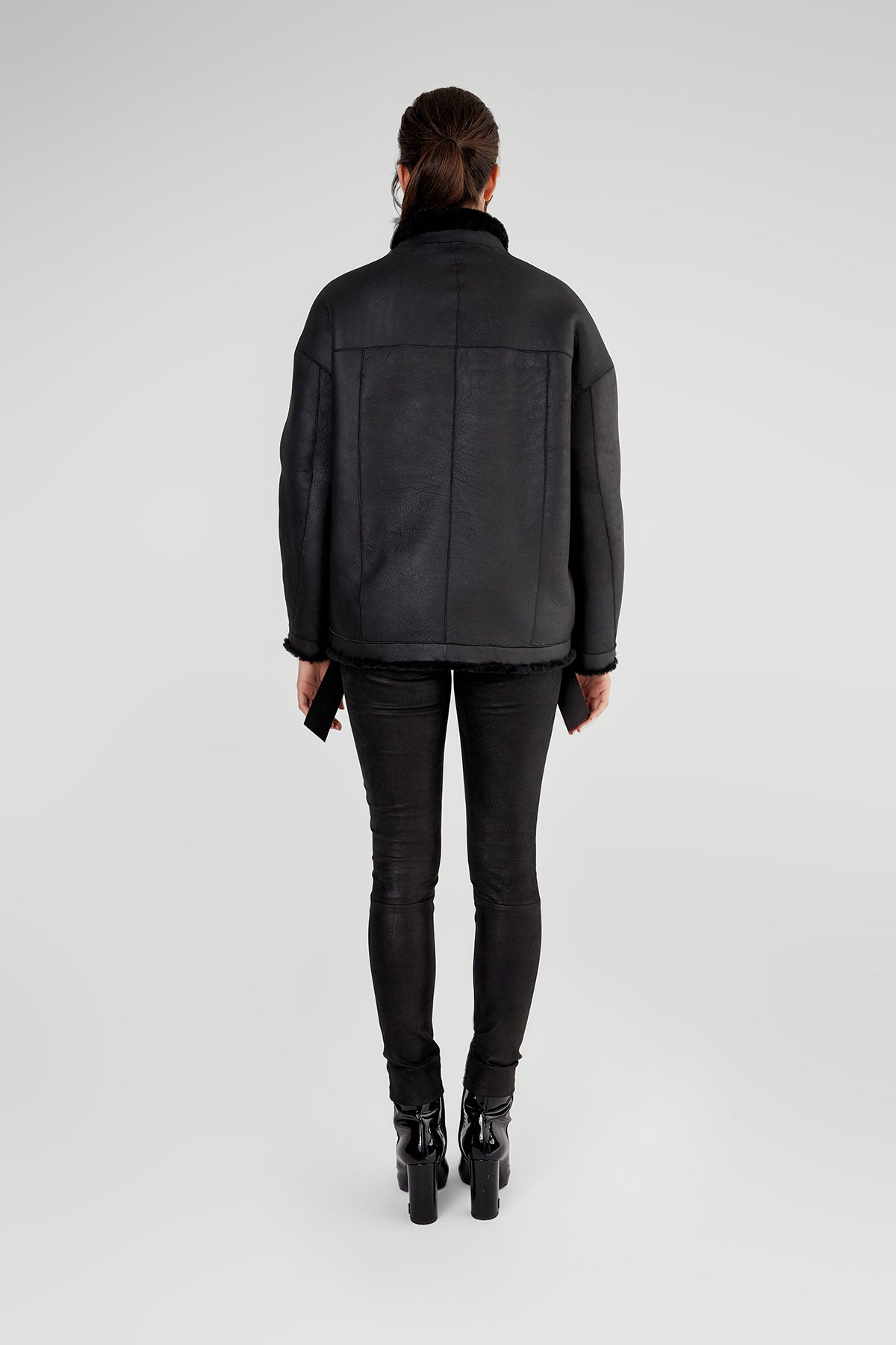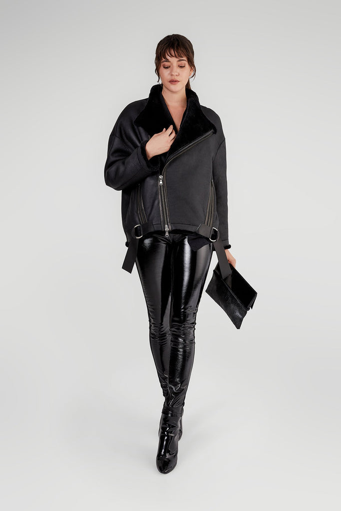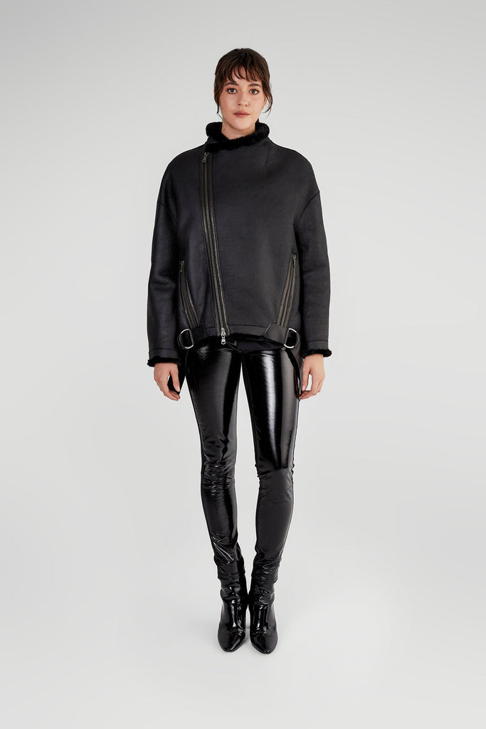 Bikerjacke aus Leder außen, mit Shearling-Futter innen. Asymmetrischer Reißverschluss und asymmetrischer Saum. Lederriemen mit Druckknopf am Saum und beidseitige Leistentaschen mit Reißverschluss. Angenehm weich.