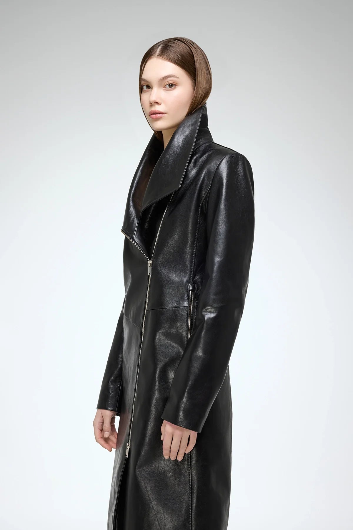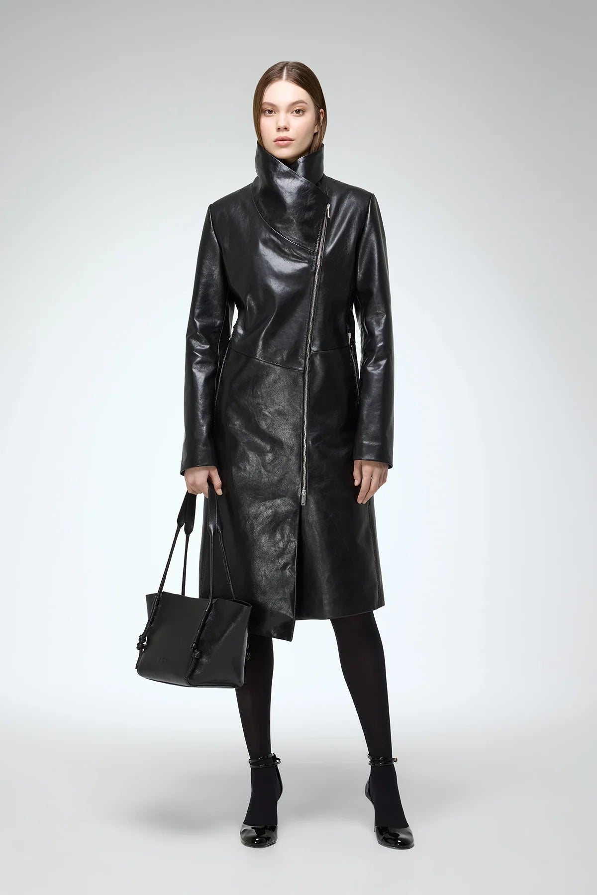 Dieser mittellange Mantel aus 100 % Lammleder mit luxuriöser Verarbeitung besticht durch einen asymmetrischen Reißverschluss und einen Stehkragen. Die strukturierte, taillierte Passform sorgt für eine elegante Silhouette, und praktische Eingrifftaschen an den Seiten runden das Design ab.