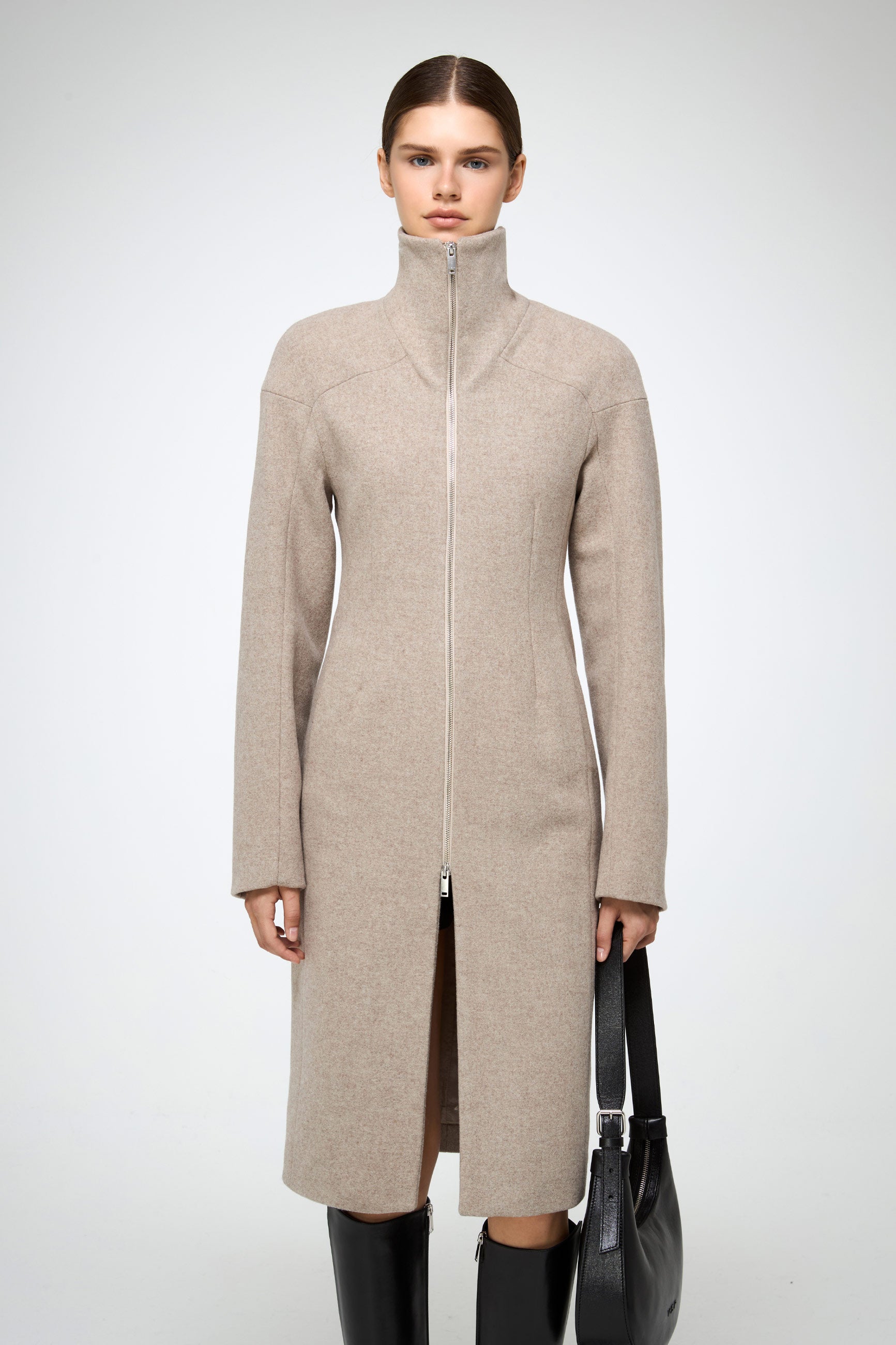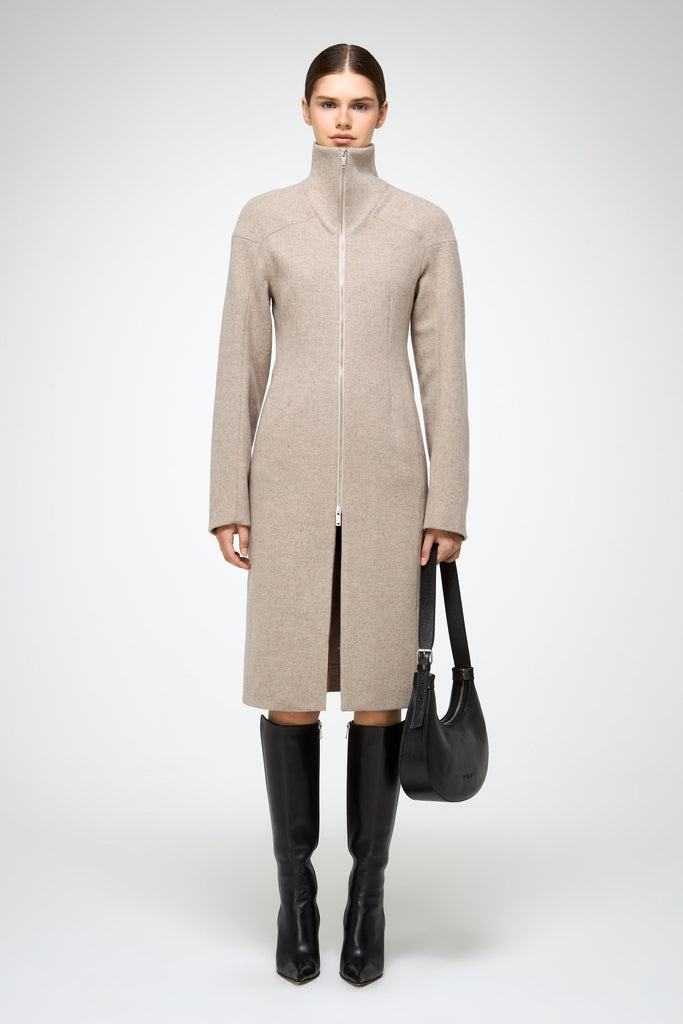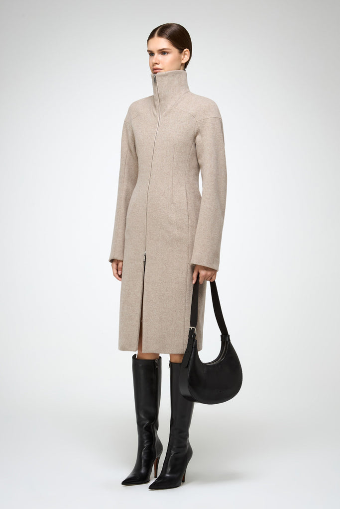 Knielanger, taillierter Wollmantel mit Reißverschluss, betonter Taille und strukturierten Schultern. Mit Seitentaschen und hohem Stehkragen.